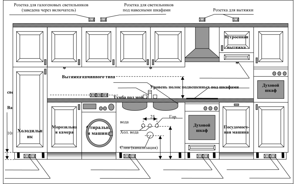 Рис.1. Общий эскиз кухонной мебели и бытовой техники с указанием правильного размещения выводов. Размеры приведены в сантиметрах.
